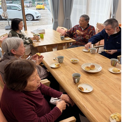 おやつはみんなでテーブルを囲んで熱々のパンを食べました!